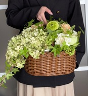 ナチュラルなバスケットに季節の花々をふんわりと束ねました。